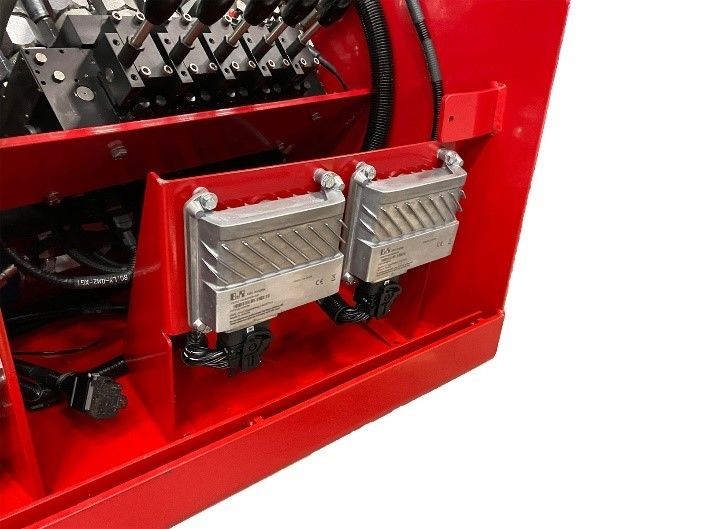 Maskinen har en styrsystemslösning uppbyggt runt en PLC från B&R:s Mobile Automation serie, X90, som är designat för extremt tuffa miljöer. Systemet bygger på, och är fullt integrerat och kompatibelt med, B&R:s övriga automationsplattform. Det innebär full skalbarhet och att hela portföljen av hård- och mjukvarukomponenter finns att tillgå. Tack vare sin IP69K kapsling är PLC:n lämplig att användas i temperaturer mellan -40 och +85 grader, den är extremt vibrationstålig och så väl skyddad att man kan till om med tvätta controllern med högtryckstvätten!