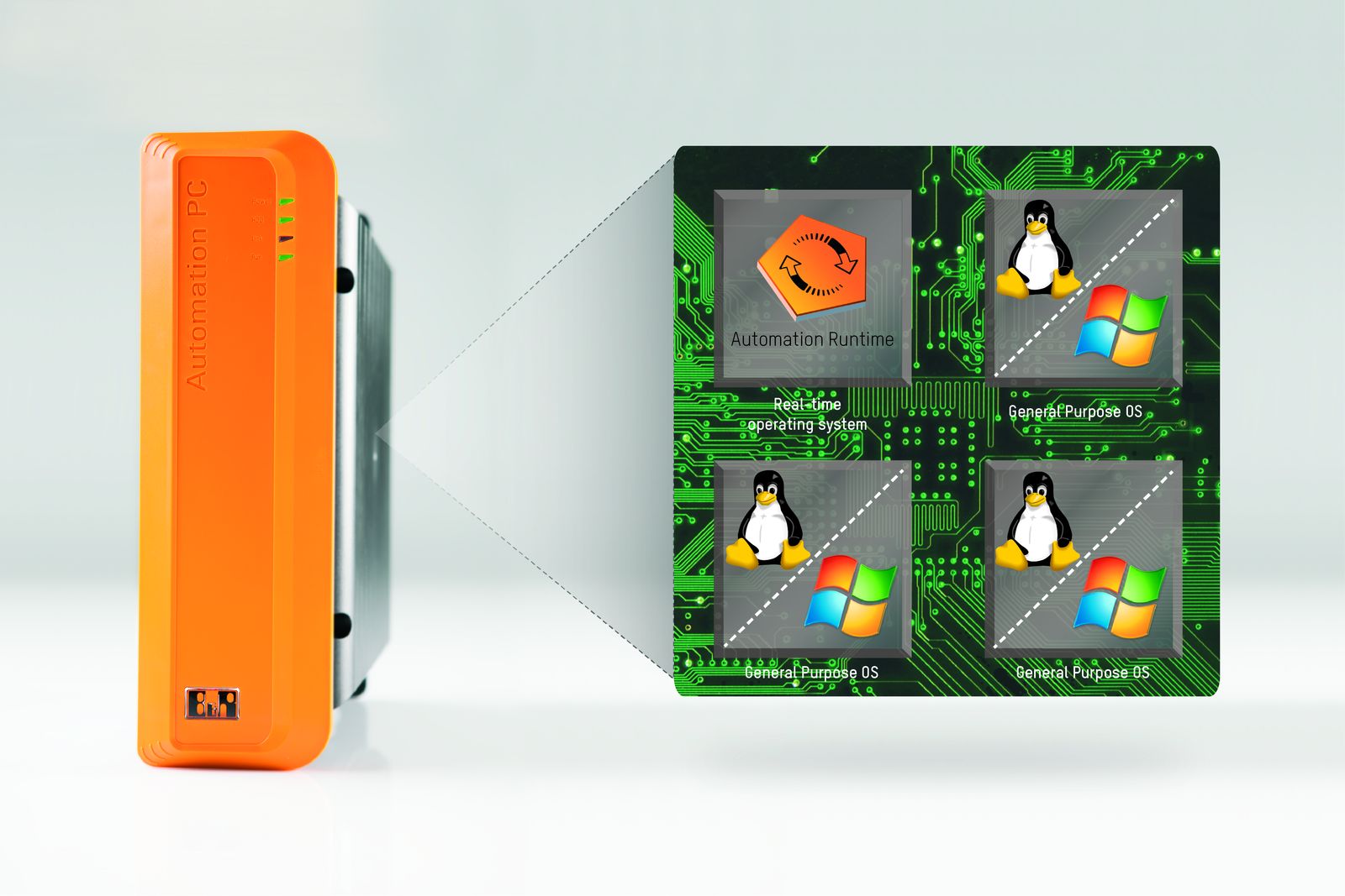 B&R, otomasyon sistemini bir Hypervisor yardımı ile genişletiyor. Bu yazılım sayesinde Windows veya Linux B&R'ın gerçek zamanlı işletim sistemi ile paralel olarak çalışabiliyor.