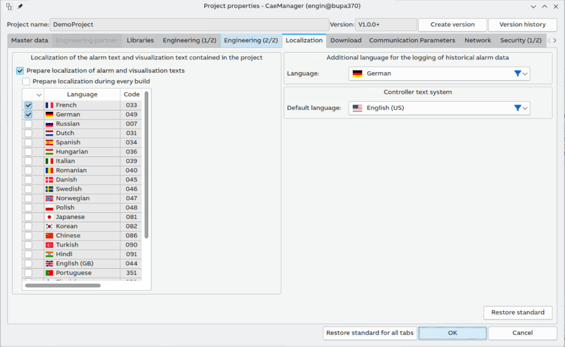 The translation texts are automatically made available to the control computers via the usual download mechanism so that current language versions are always available.