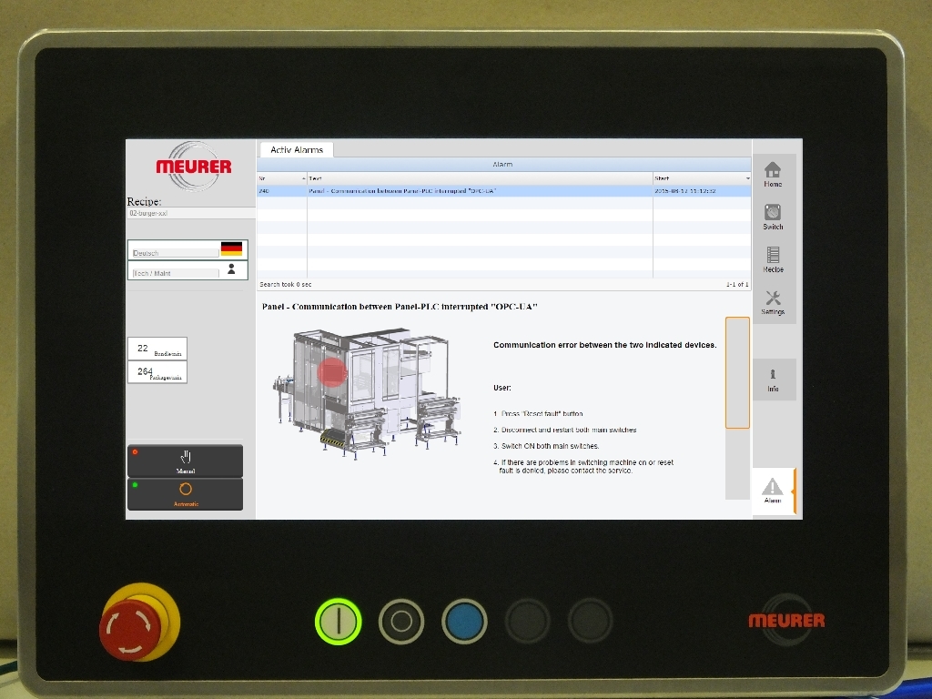 For communication between the control and HMI applications, Meurer originally used UDP telegrams. Thanks to the modular software, they were able to switch over to OPC UA very easily when the necessary libraries became available. This further reduced the effort of connecting to different controllers, which vary from customer to customer and region to region.