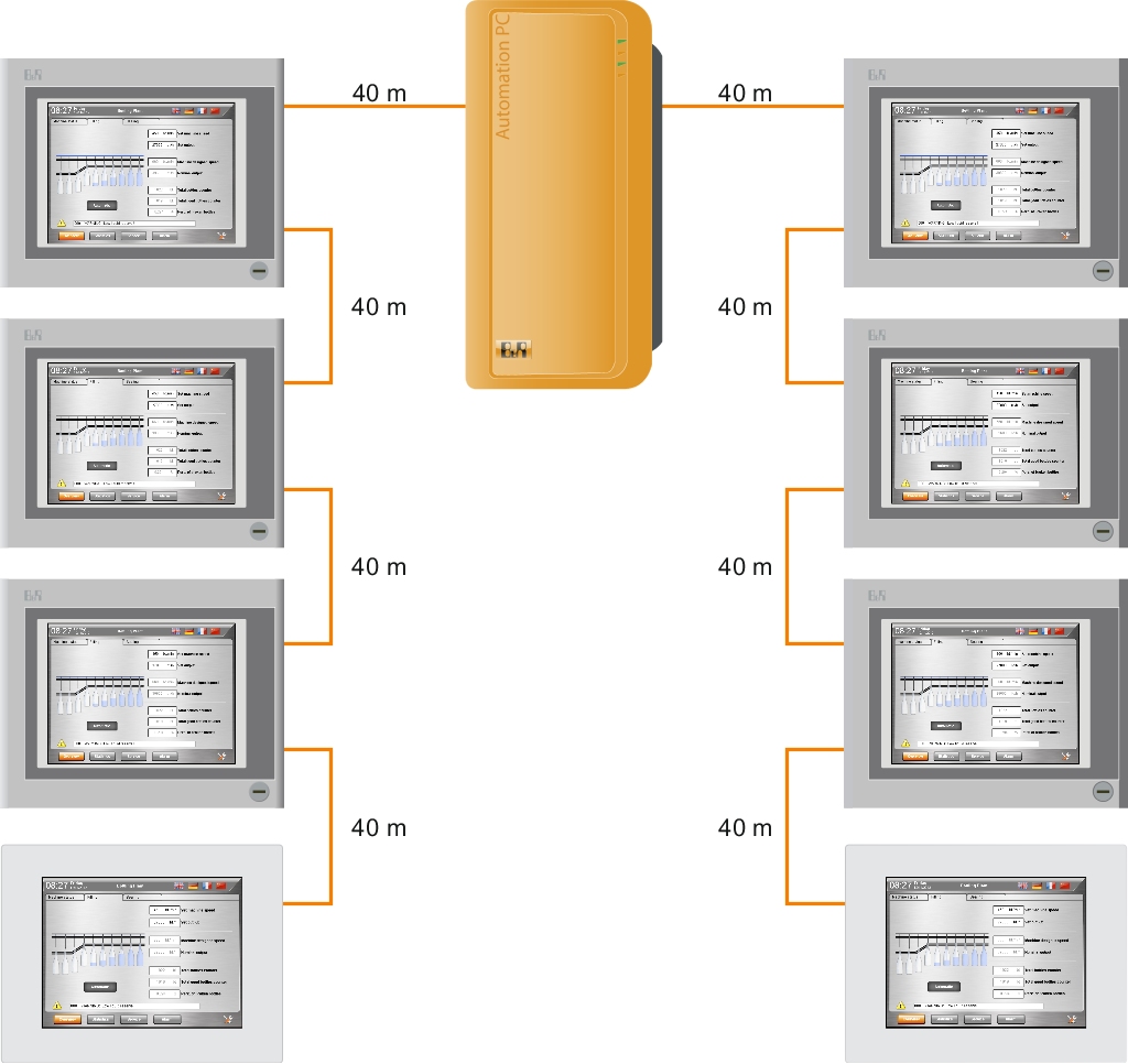 所有Automation Panel设备都可以通过智能显示连接连到Automation PC上,所有通信通道通过一根电缆实现 – 从显示和触摸屏信息一直到功能键和LED数据。键盘上还可用USB端口。
